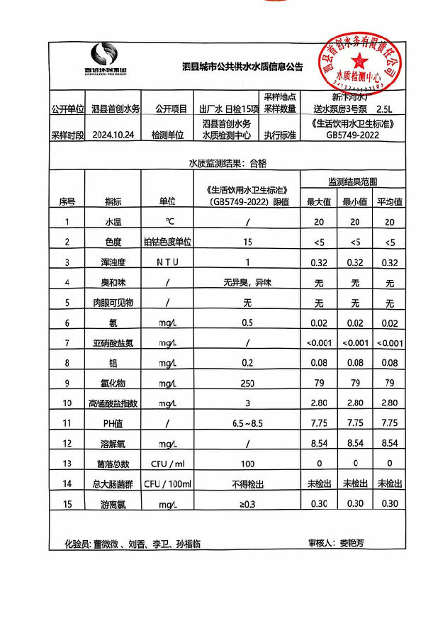 2024年10月24出厂水水质
