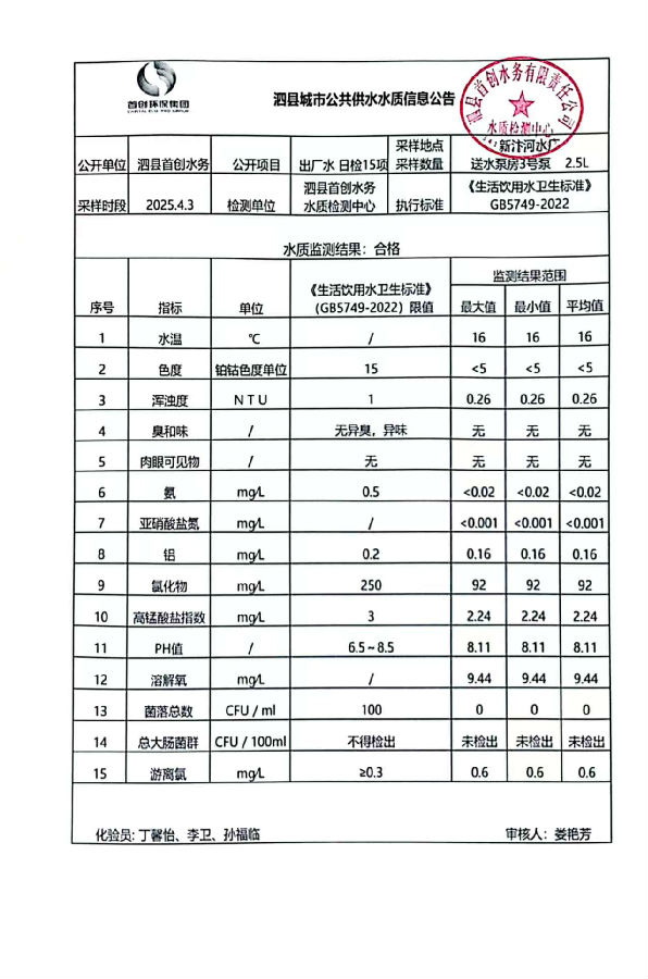 2025年4月3日出厂水水质