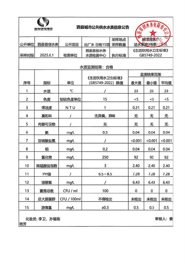 2025年6月1日出厂水水质