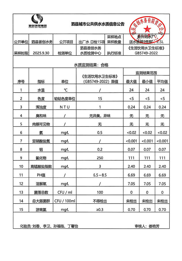 2025年9月30日出厂水水质
