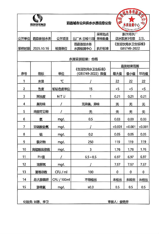 2025年10月16日出厂水水质