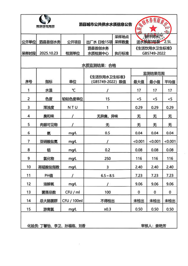 2025年10月23日出厂水水质