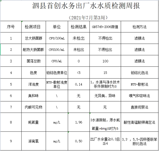 2021年7月第3周水质检测数据公示