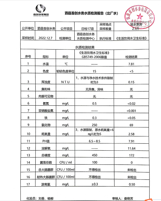 2022年12月7日出厂水水质