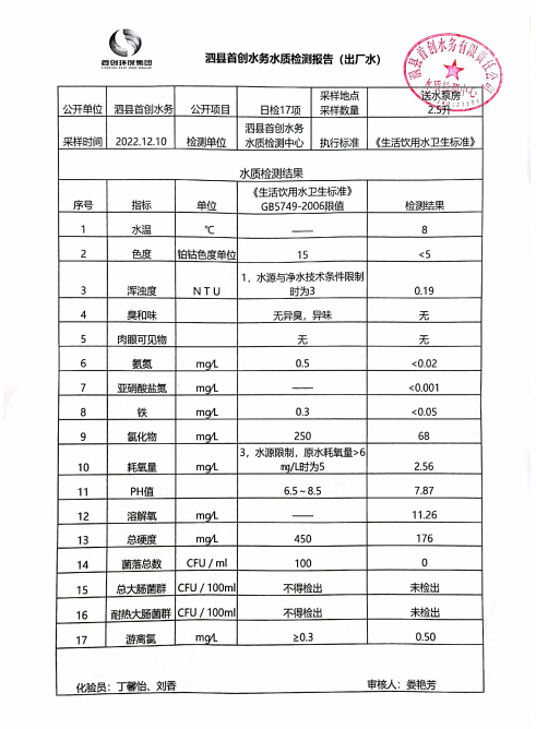 2022年12月10日出厂水水质
