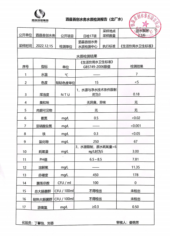 2022年12月15日出厂水水质