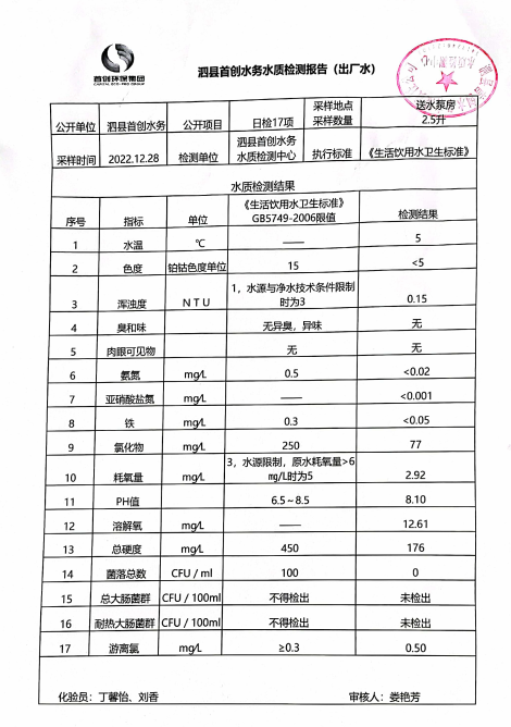 2022年12月28日出厂水水质