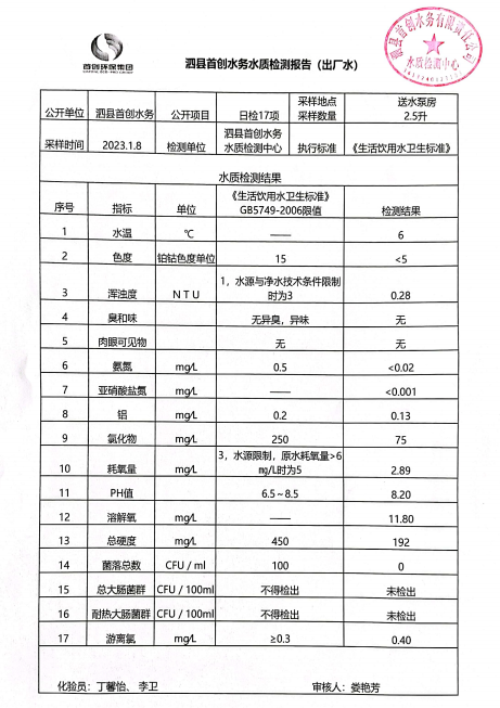 2023年1月8日出厂水水质
