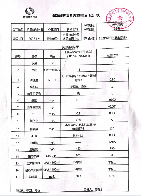 2023年1月9日出厂水水质