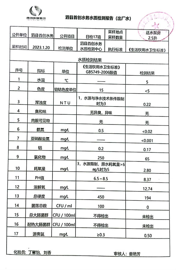 2023年1月20出厂水水质