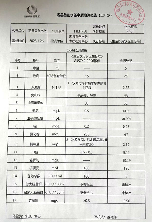 2023年1月26日出厂水水质