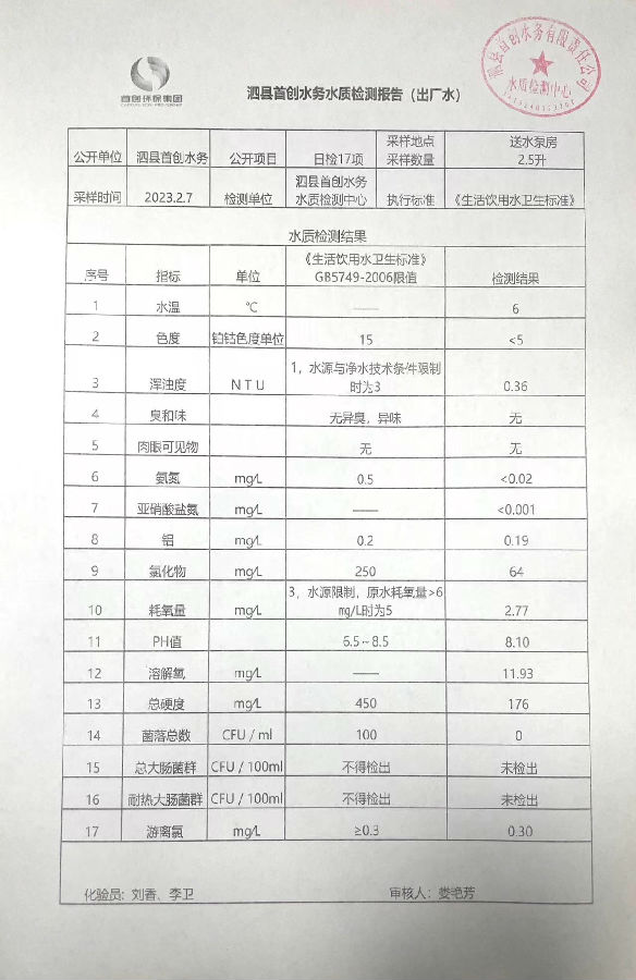 2023年2月7日出厂水水质