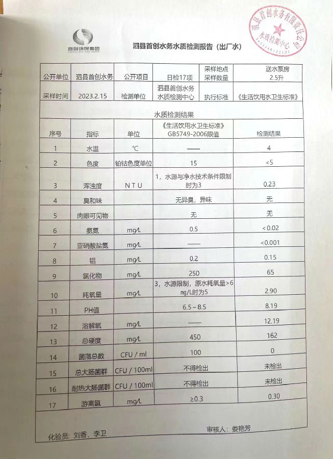 2023年2月15日出厂水水质