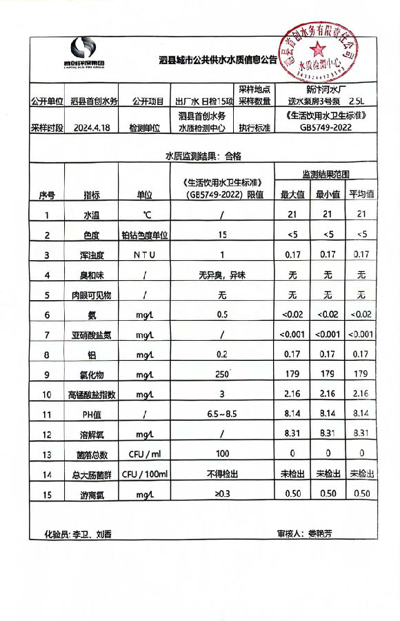 2024年4月18出厂水水质