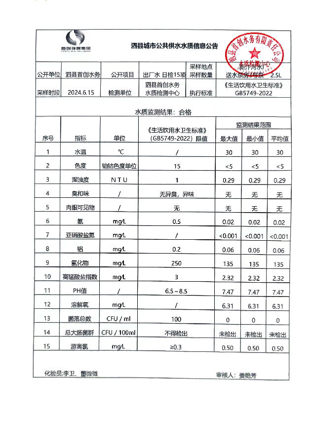 2024年6月15出厂水水质