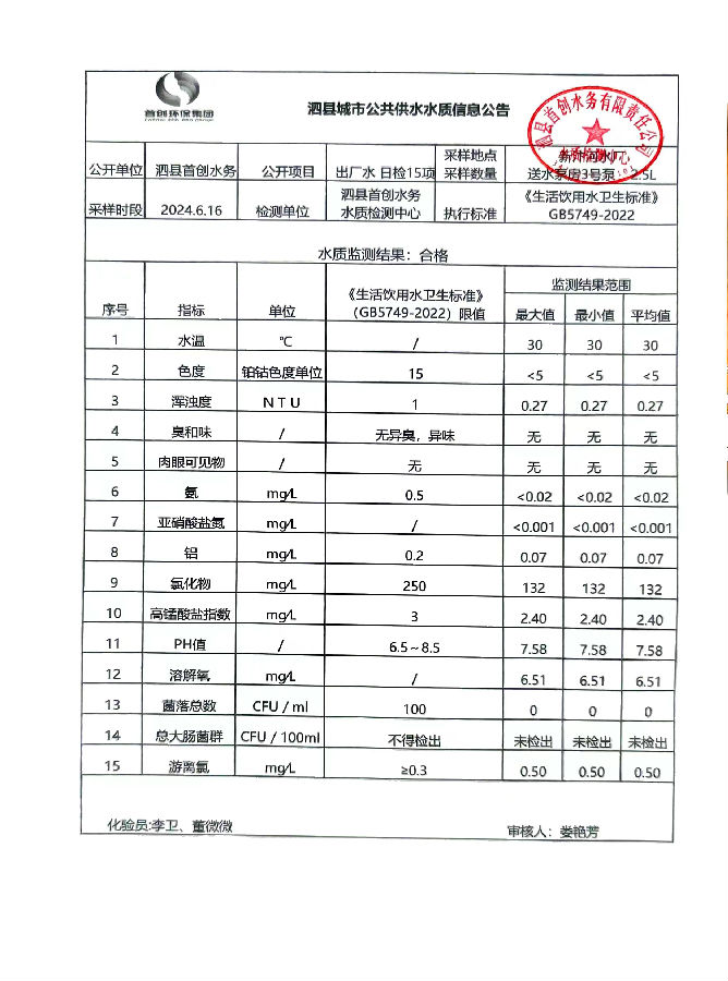 2024年6月16出厂水水质