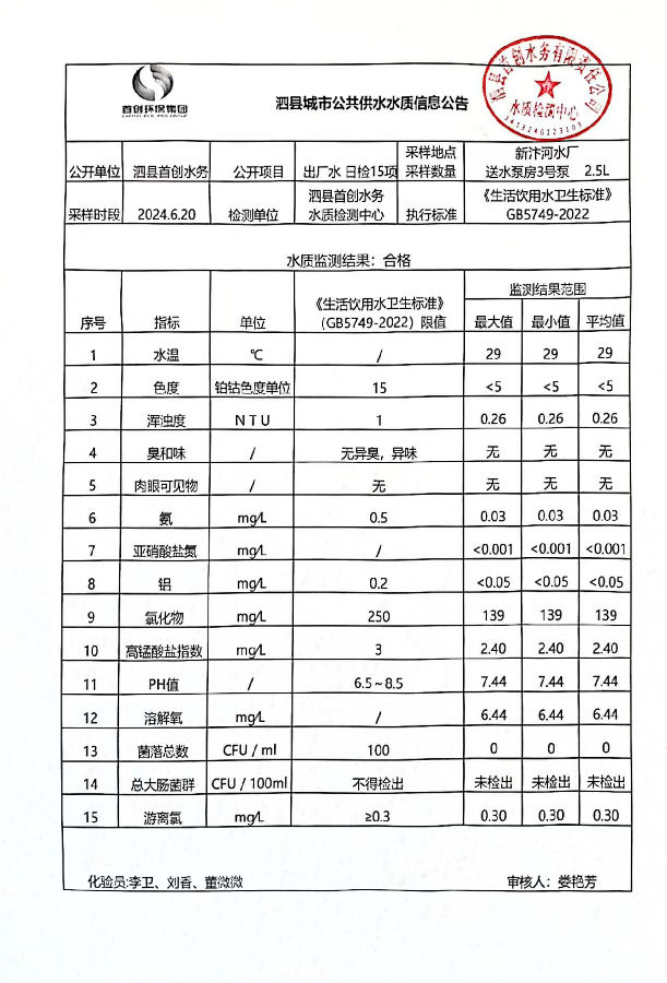 2024年6月20出厂水水质