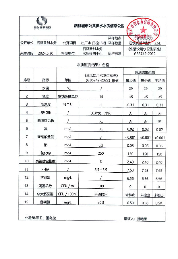 2024年6月30出厂水水质