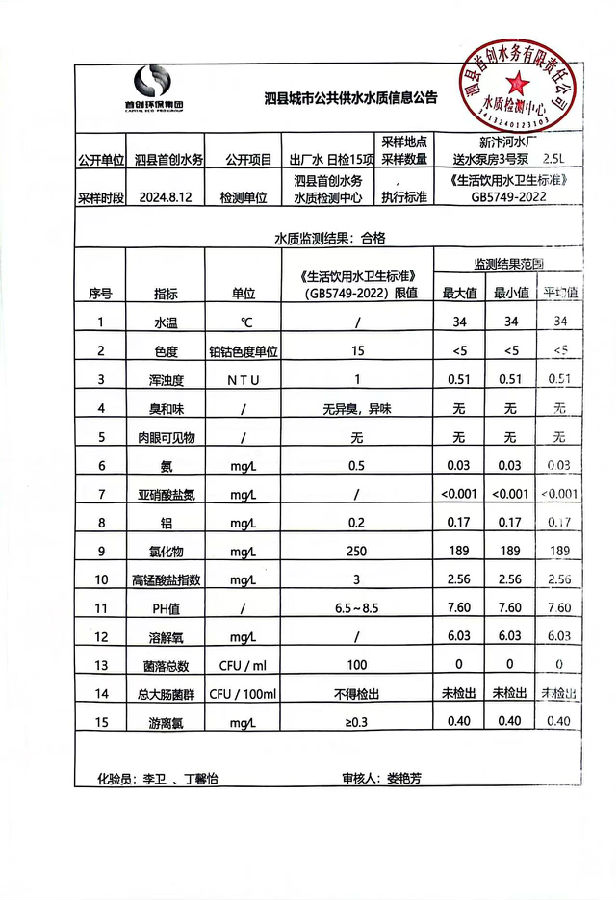 2024年8月12出厂水水质