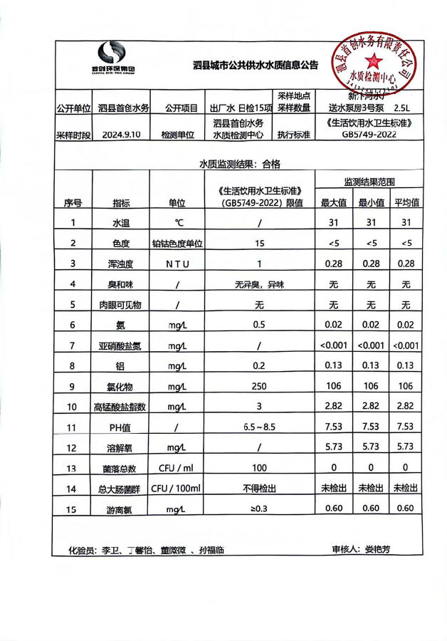 2024年9月10出厂水水质