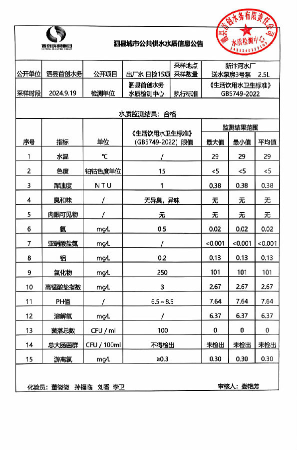 2024年9月19出厂水水质