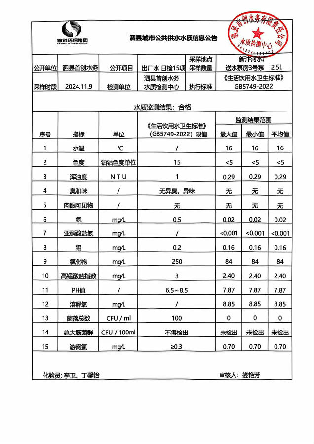 2024年11月9出厂水水质