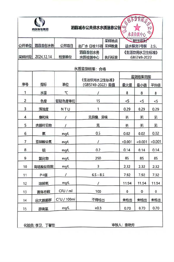 2024年12月14出厂水水质