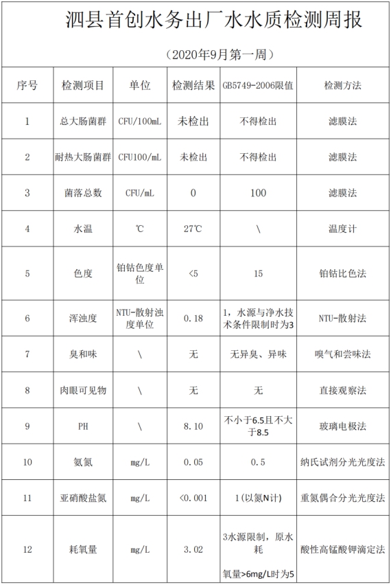 2020年9月第1周水质检测数据公示