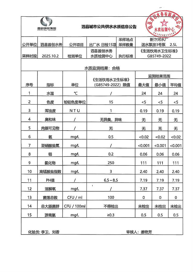 2025年10月2日出厂水水质