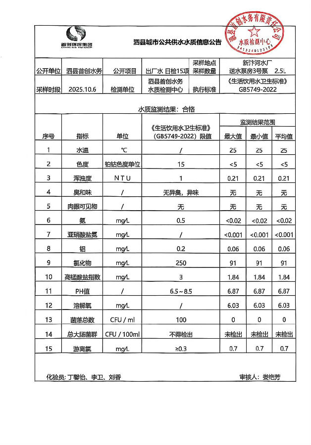 2025年10月6日出厂水水质