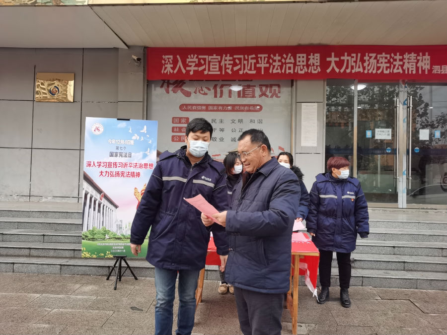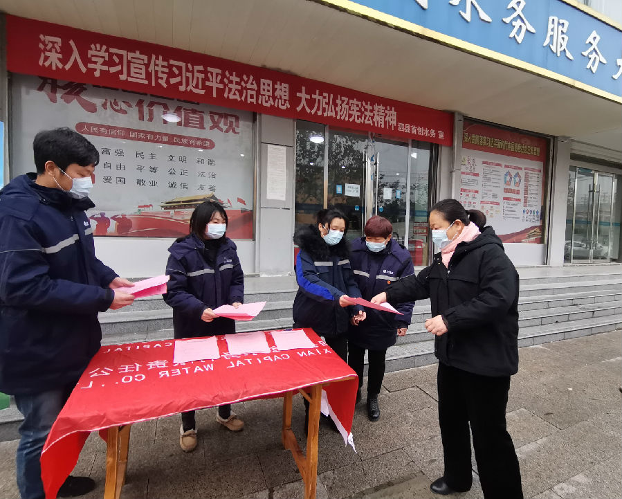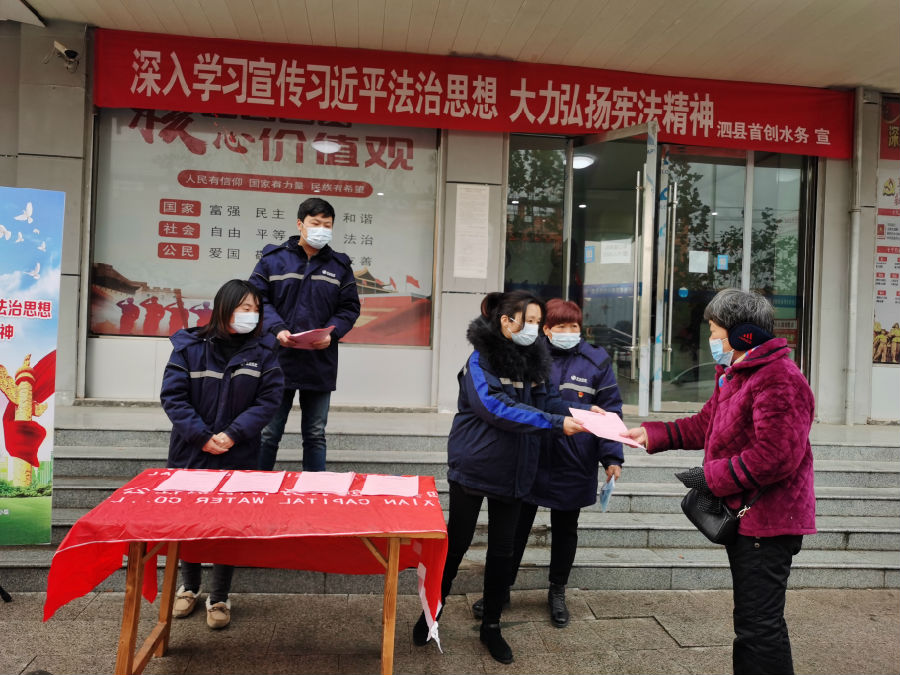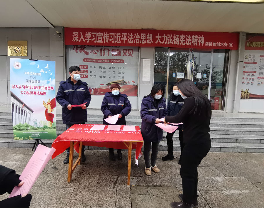 为深入贯彻党的十九大精神,进一步增强了职工、居民群众的法制观念和依法办事的自觉性,弘扬宪法精神,维护宪法权威,推动全民“深入学习宣传习近平法治思想 大力弘扬宪法精神”,根据上级党委《关于在全市开展2020年“12▪4”国家宪法日暨宪法宣传周系列宣传活动的通知》文件要求,12月7日上午,泗县首创组织党员、青年志愿者在泗县首创客户服务大厅及新汴河水厂