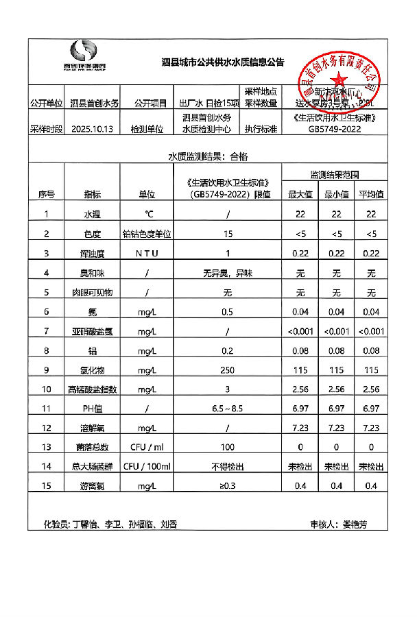 2025年10月13日出厂水水质