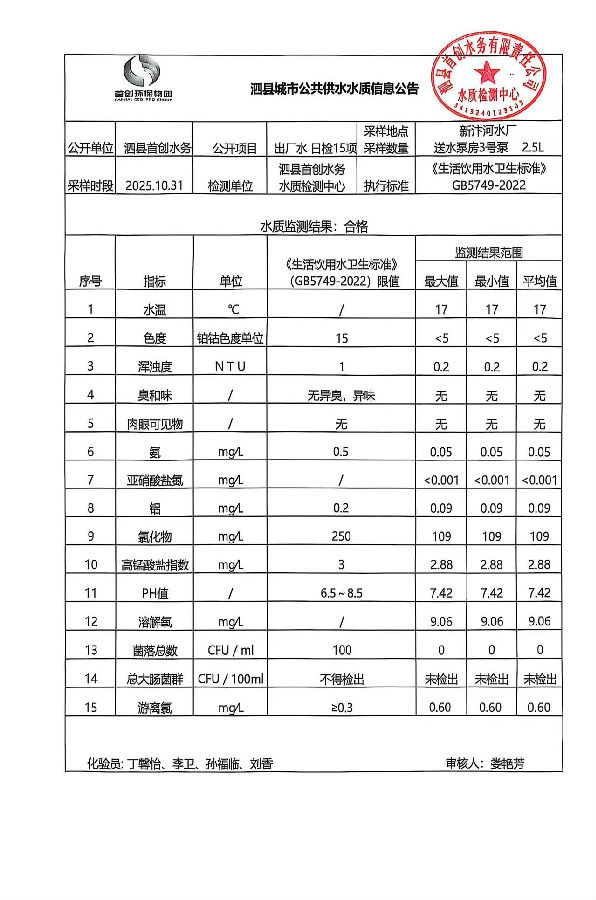 2025年10月31日出厂水水质