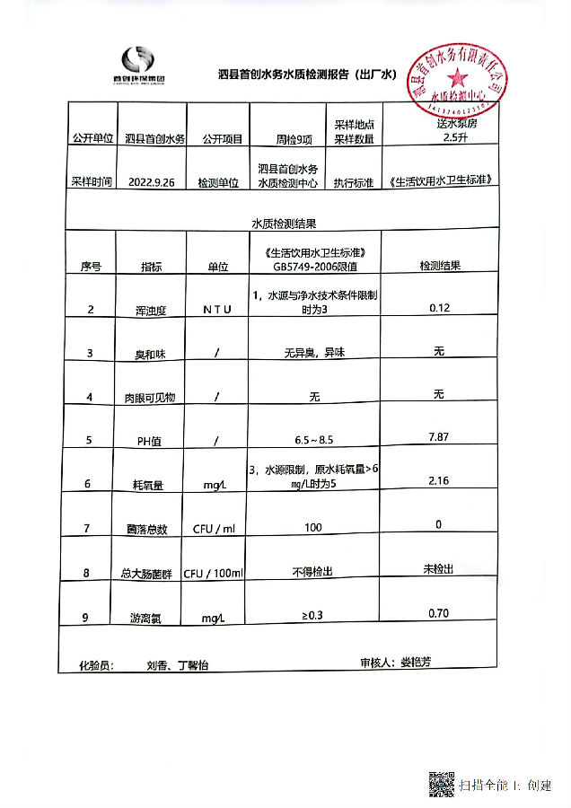 2022年9月20日-9月26日(第四周)出厂水水质